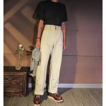TANKER工裝褲 男高腰懷舊象牙白美式復古阿美咔嘰 寬松闊腿牛仔褲