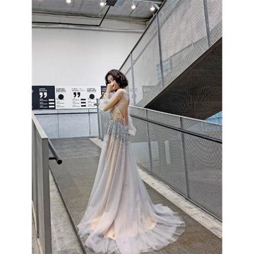 fashion氣質高端泡袖新娘敬酒服奢華晚宴年會晚禮服顯瘦p20煙灰色