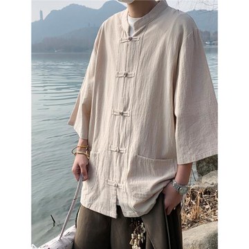 中式復古唐裝男七分袖襯衫夏季中國風半袖漢服上衣棉麻中山裝外套
