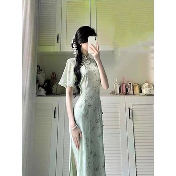 民國風氣質高級感改良少女旗袍裙女夏季復古收腰綠色新中式連衣裙