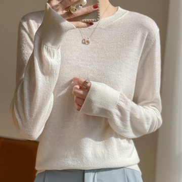 簡約百搭薄款純羊毛針織T恤打底衫女長袖毛衣內搭寬松休閑夏裝新