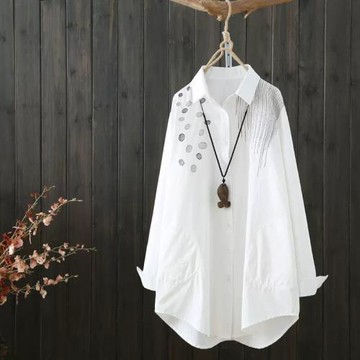 2025春秋文藝氣質中長款刺繡襯衫女打底長袖寬松大碼翻領白色襯衣
