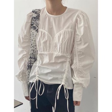 點我下載豬歐尼 韓國chic春季白色長袖襯衣法式復古設計感綁帶襯衫女上衣