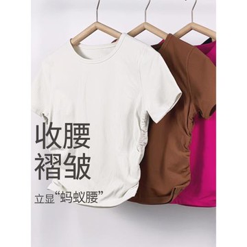 【進口紗線】瑜伽短袖女收腰顯瘦透氣圓領羅紋褶皺運動上衣