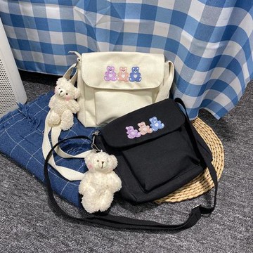 韓系ins古著感少女可愛奶油色三只小熊帆布單肩包日系原宿斜挎包