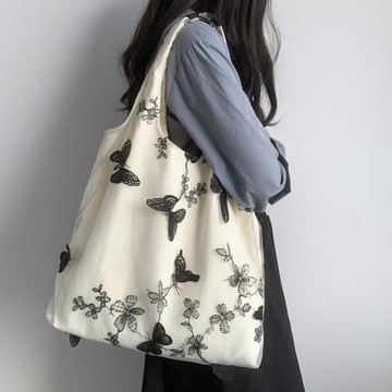 超美刺繡蝴蝶蕾絲仙女袋ins出行女包帆布包文藝大容量百搭單肩包