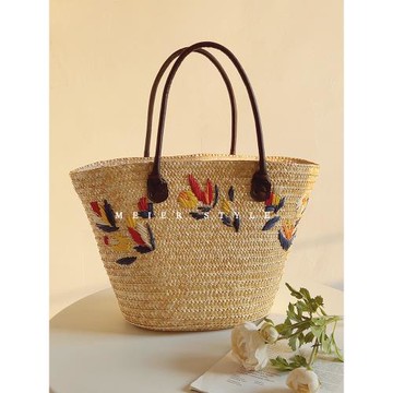 ins法式復古刺繡草編包大容量托特包編織包單肩手提包度假沙灘包