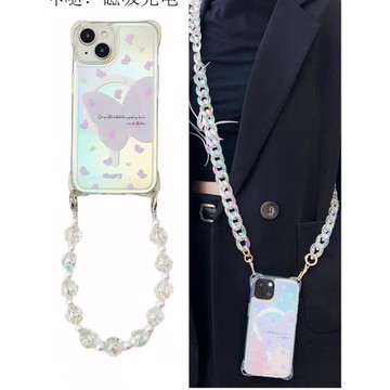 夢幻紫蝴蝶斜挎手機殼14Promax小眾手拎珍珠鏈條防摔適用于蘋果iPhone16背帶斜挎掛繩13四角開孔磁吸12個性11