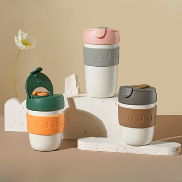 雙飲陶瓷內膽隨行杯 全陶瓷非塗層保溫杯 耐酸鹼環保飲料咖啡杯 淺粉色 340ml 1個