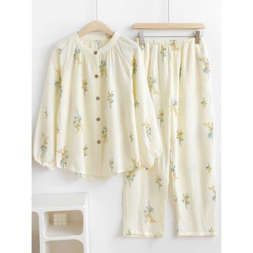 雙層泡泡紗睡衣女春秋夏款純棉紗布布料長袖薄款可外穿家居服圓領