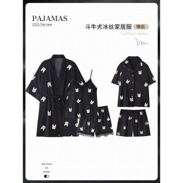周深白鹿同款睡衣男女夏季冰絲短袖春秋情侶仿真絲小狗明星家居服
