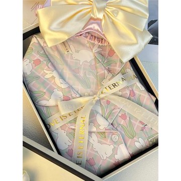插畫兔子郁金香短袖絲綢睡衣女夏季冰絲家居服薄款送閨蜜生日禮物