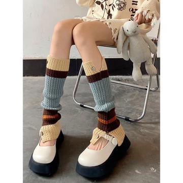 夜間教習室針織襪套春秋款紐扣襪子拼色中筒堆堆襪毛線腿套小腿襪