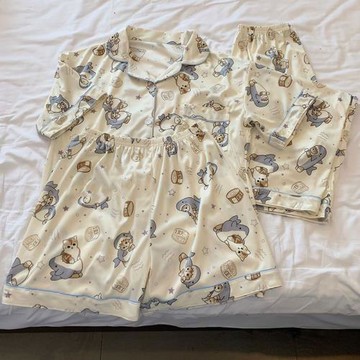 卡通可愛純棉睡衣女款春夏季大碼短袖長褲三件套裝夏天家居服外穿