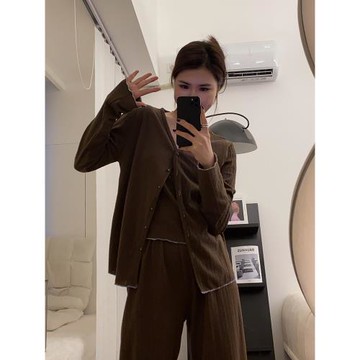 日系提花純棉睡衣女士慵懶春秋薄款長袖長褲純色ins三件套家居服