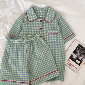ins風睡衣女夏天薄款短袖短褲兩件套裝日系格子可外穿學生家居服