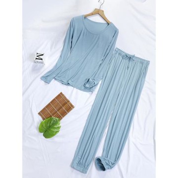女士春秋圓領竹節棉竹纖維長袖薄款睡衣莫代爾束腳套裝家居服外穿