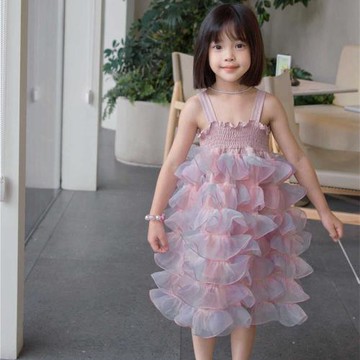 BangBang飽飽 ins風女童夏季粉色公主連衣裙生日炫彩網紗吊帶裙