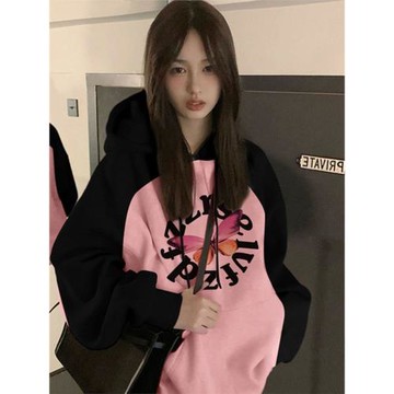 2024冬季新款爆款連帽衛衣女寬松慵懶風大碼撞色抽繩加絨加厚外套
