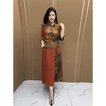 真絲旗袍兩件套裝裙氣質媽媽中式國風改良花色套裙50歲民族風裙子