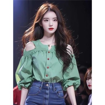 點我下載短袖襯衫女設計感小眾今年流行的漂亮上衣綠色露肩泡泡袖2024夏季