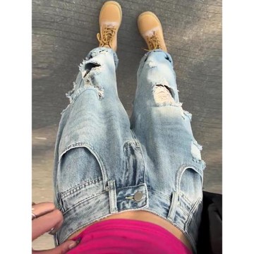 做舊美式辣妹牛仔顯腿長短褲百搭新款設計感磨破春季鉚釘翹臀熱褲