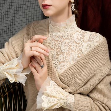 La Belleza立領鬆緊柔軟植絨毛料蕾絲鏤空花朵小喇叭袖蕾絲內搭上衣