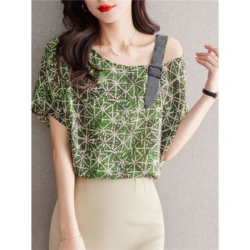 性感露肩印花雪紡衫夏季女裝2025新款女短袖洋氣薄款鎖骨體恤小衫