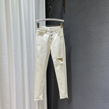 2024年春夏新款修身顯瘦高腰百搭單排扣破洞緊身牛仔褲女鉛筆褲潮