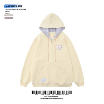 KKyesiou美式復古麂皮絨字母刺繡情侶衛衣男女款潮牌加絨連帽外套
