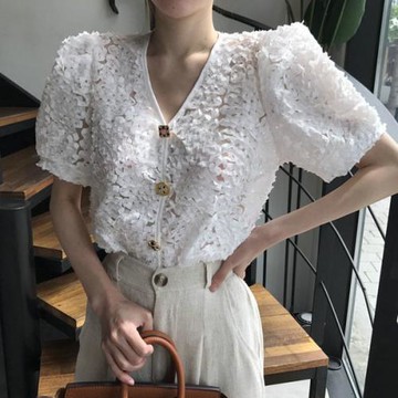 【sol.owen】韓國進口立體花朵單排復古紐扣泡泡袖襯衫 blouse