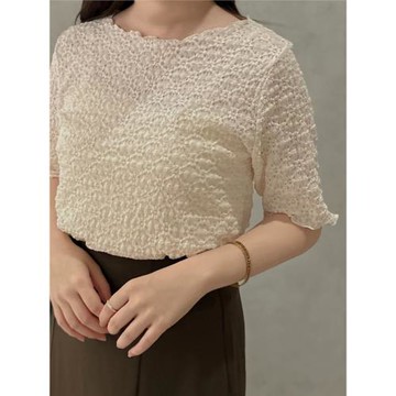純色立體紋理繡花鬆緊五分袖上衣