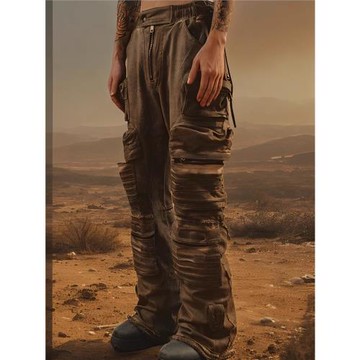 DRKLEI-24AW重工立體貼袋疊層做舊洗水工藝闊腿大喇叭廢土工裝褲