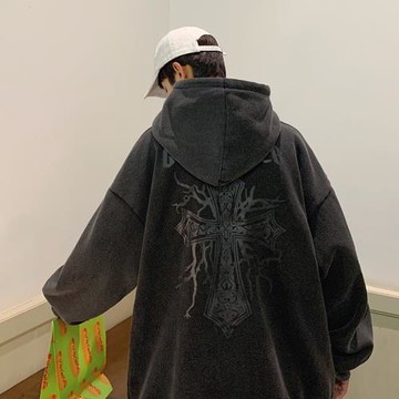 十字架水洗做舊vintage重磅衛衣oversize高街男美式復古連帽外套