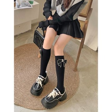 韓國水鉆蝴蝶結中筒襪純棉豎條紋小腿襪子女羊絨保暖大腿襪顯瘦
