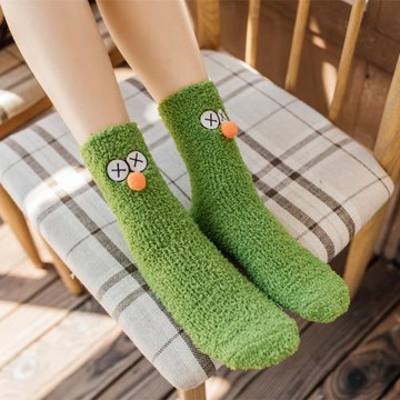 毛毛絨襪子女冬睡覺襪純色眼睛刺繡地板襪大人月子襪家居珊瑚絨襪