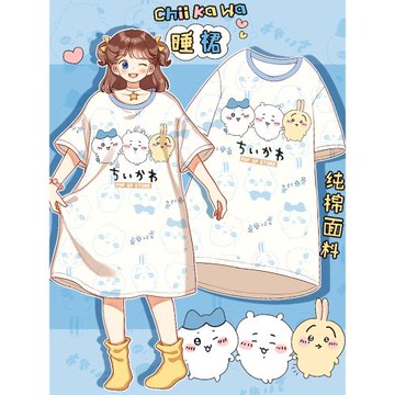 日系可愛chiikawa睡裙女夏季純棉短袖烏薩奇睡衣女薄款卡通家居服