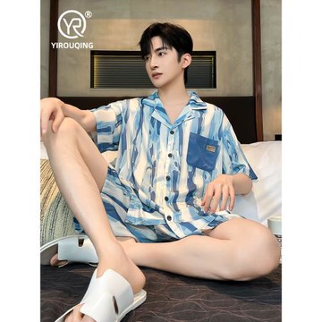 悅內睡衣男士夏季冰絲仿真絲短袖短褲男款家居服絲綢薄款高檔套裝