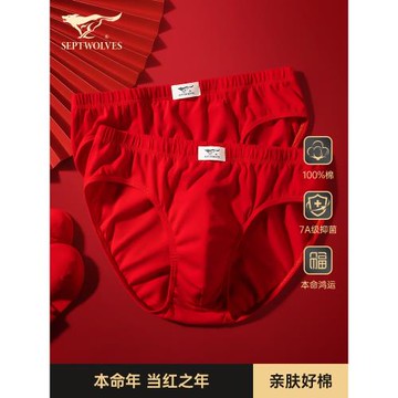 七匹狼男士紅內褲男三角褲純棉短褲男生本命年屬馬大紅色全棉結婚