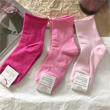 粉色襪子女韓國糖果彩色純棉卷邊中筒襪韓版百搭基礎款堆堆短襪薄