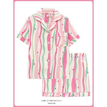 外貿甜美人棉綿綢條紋開衫~卡通短袖家居服套裝 寬松單排扣睡衣褲