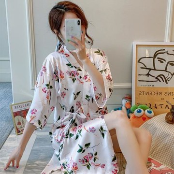 日系和服性感睡衣女夏季短袖浴衣睡袍冰絲綢薄款寬松中長款家居服