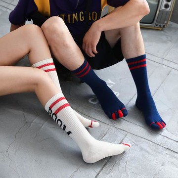 2雙裝 秋冬全棉五指襪厚男女中筒襪條紋襪高筒保暖分趾襪子純棉襪