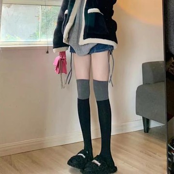 秋冬拼色過膝襪女黑灰撞色中筒襪保暖棉質高筒襪學院風長筒大腿襪