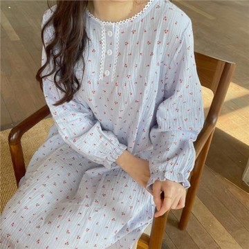 日系綿軟~女純棉楊柳縐布秋季寬松大碼家居睡裙長款可愛外穿睡衣
