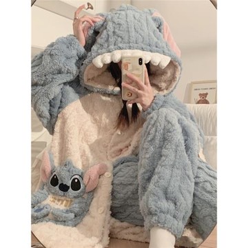 (免運)情侶睡衣女款三層夾棉冬季珊瑚絨卡通鯊魚連帽加厚男士家居服套裝