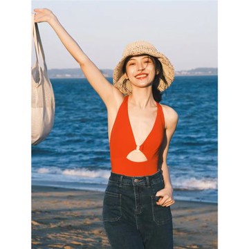 泳衣女款泡溫泉復古港風性感紅色三角連體比基尼海邊沙灘度假泳裝