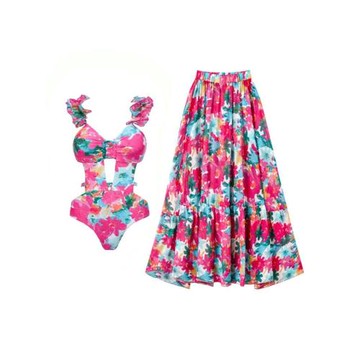 歐美時尚外貿溫泉沙灘派對泳裝 印花鏤空網紗裹裙連體泳衣2件套裝