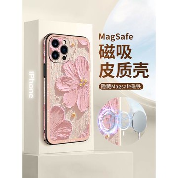 磁吸油畫花朵蘋果15promax手機殼高端iphone16pro皮紋13MAGSAFE女款12全包防摔14plus磨砂pro個性12側邊圖案