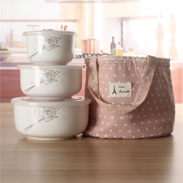 陶瓷保鮮碗三件套套裝飯盒便當盒圓形陶瓷碗微波爐真空密封蓋配袋